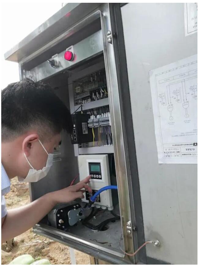 鄒工在現(xiàn)場調(diào)試,電磁流量計進行計量,數(shù)據(jù)通過云平臺進行監(jiān)控,現(xiàn)場總計裝有56臺分體式電磁流量計。