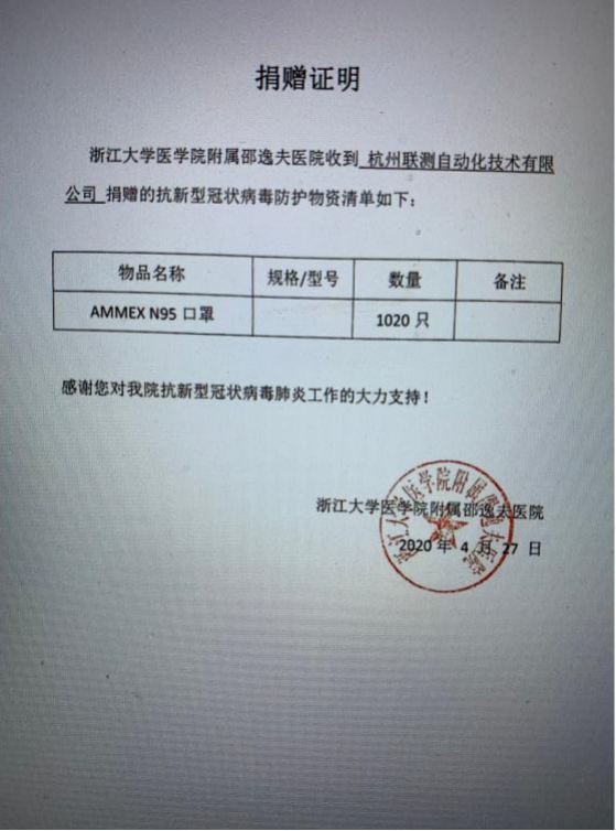 自新冠肺炎疫情爆發(fā)以來,杭州聯(lián)測自動化有限公司累積向邵逸夫醫(yī)院捐贈1020只N95醫(yī)用口罩,為當?shù)氐目挂咭痪€的醫(yī)護人員提供一份保障。