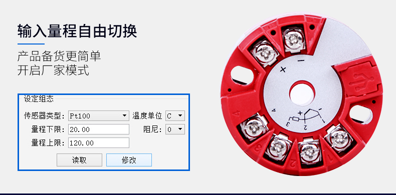 溫度變送器采用熱電偶、熱電阻作為測溫元件,從測溫元件輸出信號送到變送器模塊,經(jīng)過穩(wěn)壓濾波、運算放大、非線性校正、V/I轉(zhuǎn)換、恒流及反向保護等電路處理后,轉(zhuǎn)換成與溫度成線性關(guān)系的4~20mA電流信號0-5V/0-10V電壓信號,RS485數(shù)字信號輸出。