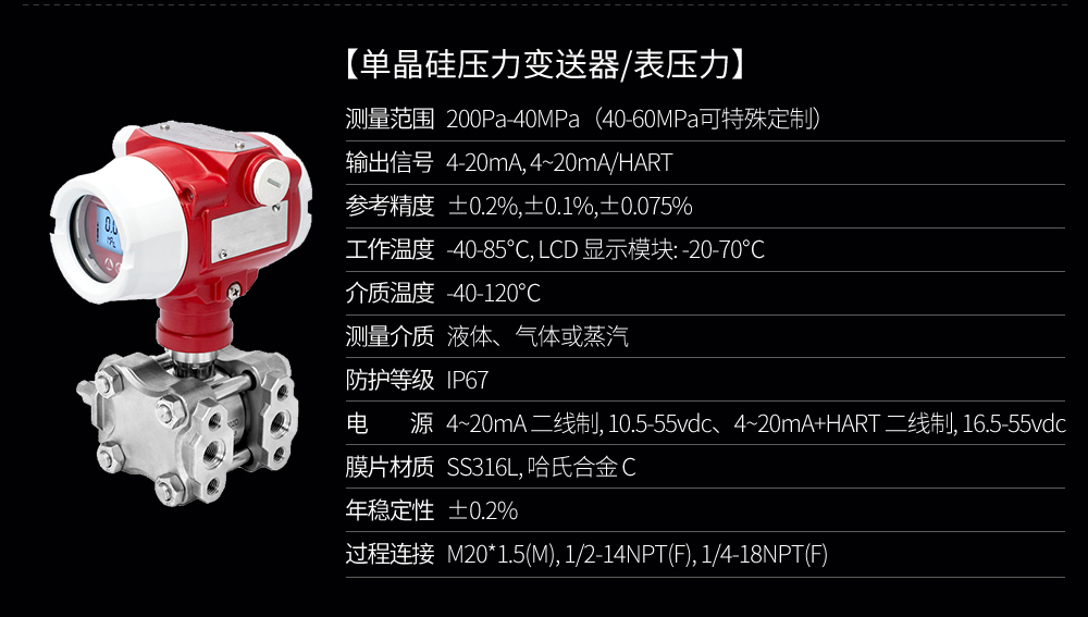 單晶硅壓力變送器用于測量液體、氣體或蒸汽的液位、密度、壓力,然后將其轉(zhuǎn)變成4-20mAHART電流信號輸出