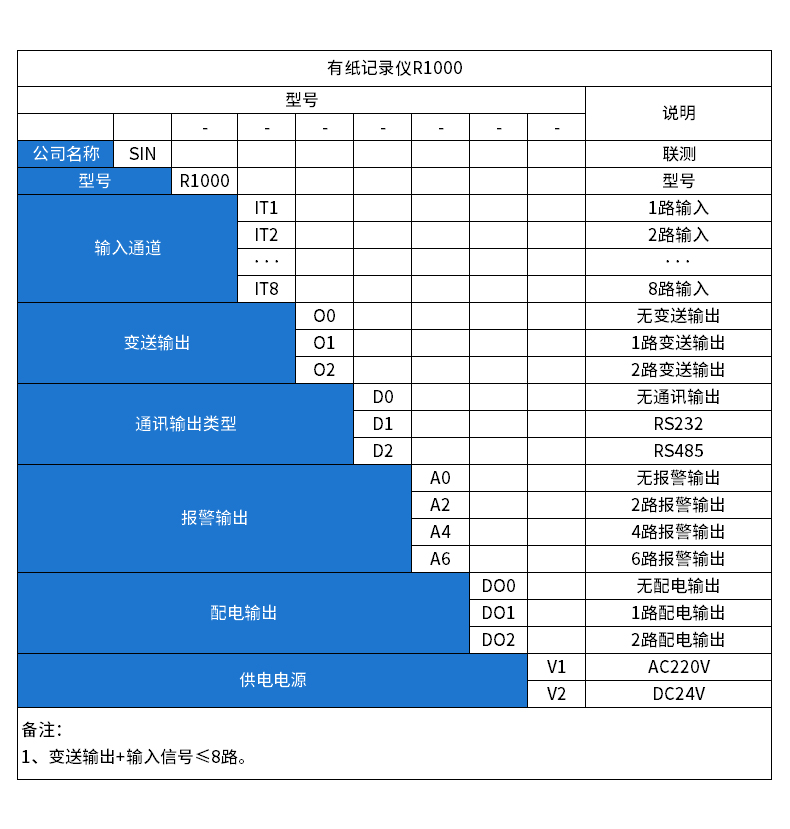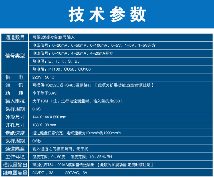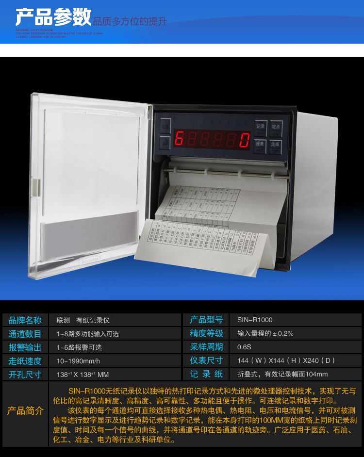 SIN-R1000有紙溫度記錄儀最多具有8路輸入通道,2路模擬量輸出,通道之間采用點(diǎn)點(diǎn)隔離;均可直接選擇接收多種熱電偶、熱電阻、壓力變送器、電壓、電流信號(hào)